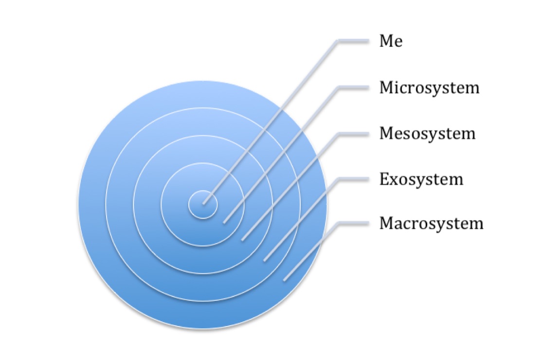 Environmental contexts are important to consider when reflecting on your own development as a college student. There are five levels that affect a person’s development: microsystems, mesosystems, exosystems, macrosystems, and chronosystems (Bronfenbrenner, 1977, 1986, 1994, 2005). For the purpose of this entry, I will focus on the first four levels. According to Barber, Espino, and Bureau (2015), “these levels demonstrate the interrelated effect of social context and process on individuals over time” (p. 248).